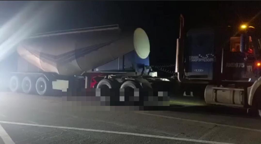 Según versión del conductor del camión, el peatón transitaba por vía e invadió el carril y quedó aplastado por las llantas del cabezal .