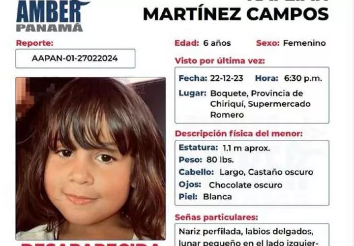 La menor de 6 años, fue vista por última vez el 22 de diciembre de 2023, alrededor de las 6:30 de la tarde en las cercanías del supermercado Romero, en Bajo Boquete, distrito de Boquete, provincia de Chiriquí.