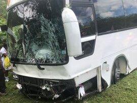 La parte frontal del bus presenta daños en vidrio y carrocería.