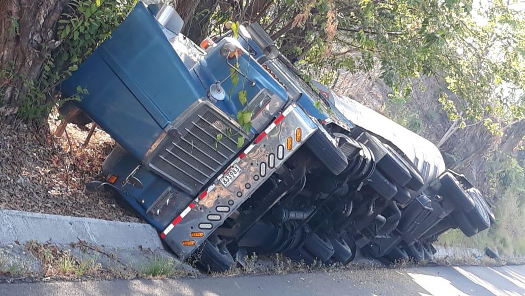 Al lugar llegaron las unidades de los bomberos, quienes señalaron que se utilizarán una grúa para sacar de la cuneta el cisterna.