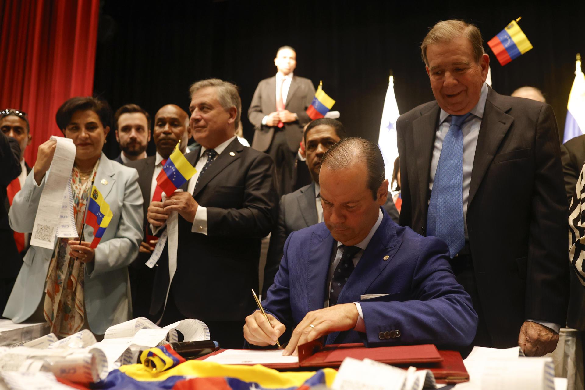 El líder opositor venezolano, Edmundo González Urrutia, dijo este miércoles en Panamá que "de la suerte" de la lucha de la oposición contra el Gobierno de Nicolás Maduro en Venezuela "depende en gran medida la estabilidad democrática" del hemisferio, en un evento donde también entregaron "todas" las actas que darían el triunfo a González Urrutia.