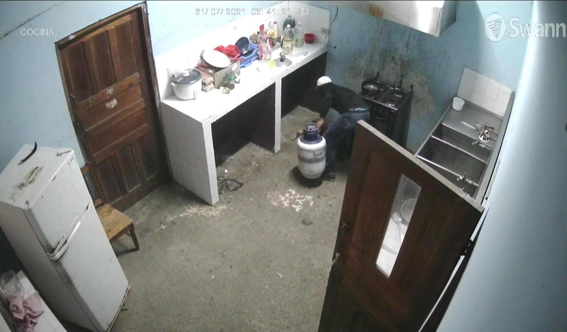 Posteriormente se observa cómo este sujeto remueve una de la ventanas de vidrio e ingresa al lugar, recorriendo varios puntos dentro de las instalaciones, donde toma del escritorio al parecer las computadoras, para luego dirigirse a la cocina donde se observa que saca el tanque de gas.