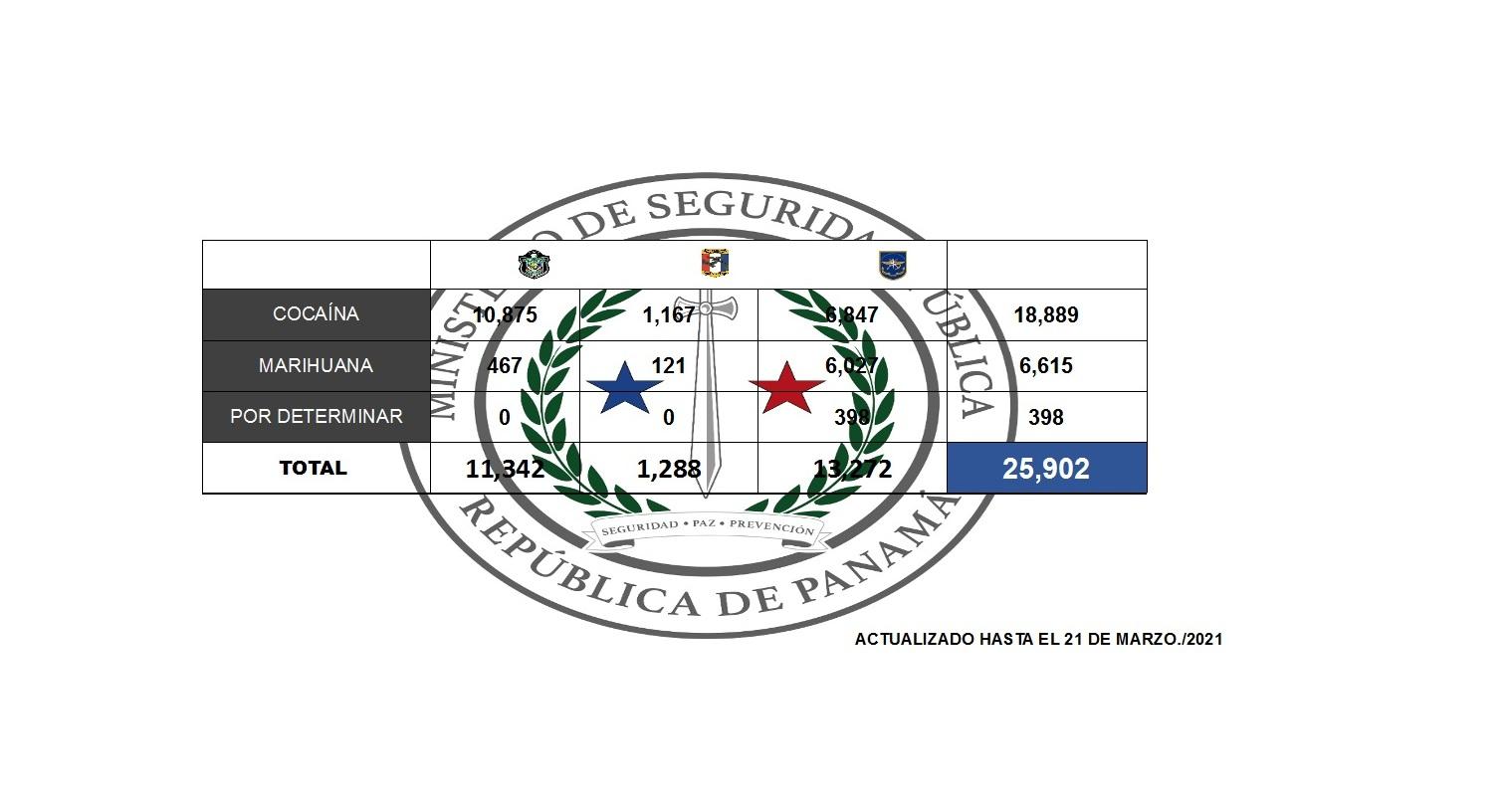 El ministro de Seguridad, Juan Pino indicó que hasta la fecha del 2021 se han confiscado 24 mil 726 paquetes -cocaína y marihuana-, que suman cuatro toneladas más que en el 2020, en el mismo periódo.