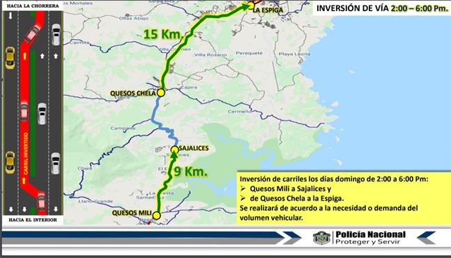 La Dirección Nacional de Operaciones de Tránsito de la Policía Nacional, informa a través de su cuenta de Twitter, que los días domingos se realizará a partir de las 2:00 p.m. hasta las 6:00 p.m, inversión de vías en dos puntos el primero desde Quesos Mili hasta Sajalices, y el segundo punto desde Quesos Chela hasta la Espiga de la Chorrera.