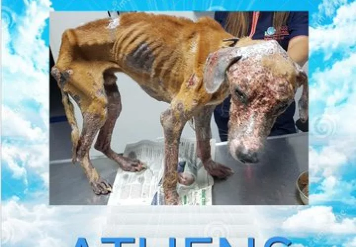 Su nombre era Athens. La crueldad de sus dueños lo llevó marcada en su piel afectada y quemada. Su cuerpo mostraba el evidente estado de desnutrición en el que fue encontrado.