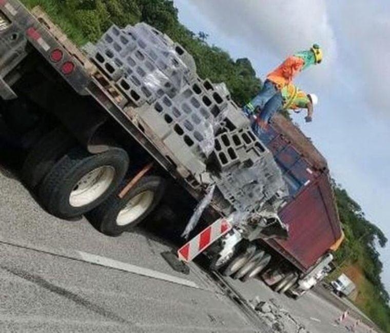 El camión que transportaba materiales de construcción embistió la parte trasera de un contenedor que era transportado por una mula. Del aparatoso impacto, los bloques cayeron encima de la mula, atrapando al conductor y a su acompañante entre los hierros retorcidos.