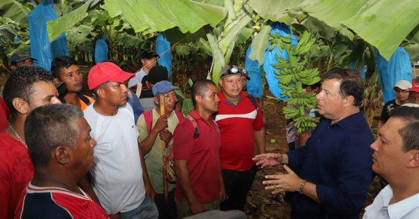 A 30 días del primer corte de banano para exportación en las fincas bananeras en el corregimiento de Puerto Armuelles, distrito de Barú, provincia de Chiriquí, el presidente de la República, Juan Carlos Varela Rodríguez, realizó una inspección por los cultivos de la finca Jobito, acompañado de los ejecutivos de la empresa Banapiña y ministros de Estado.