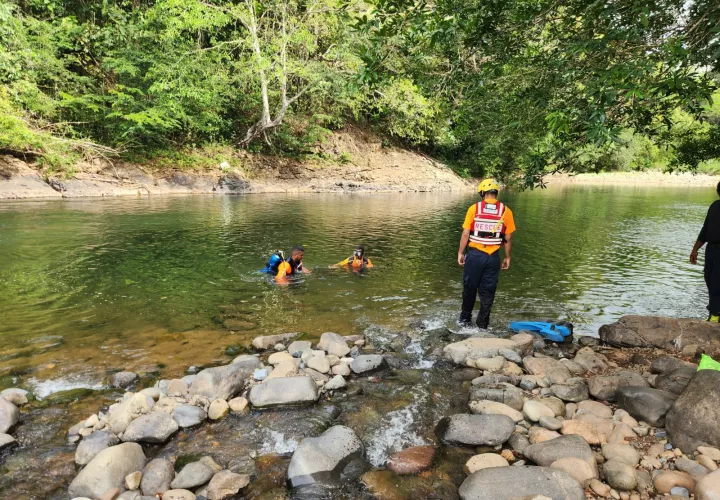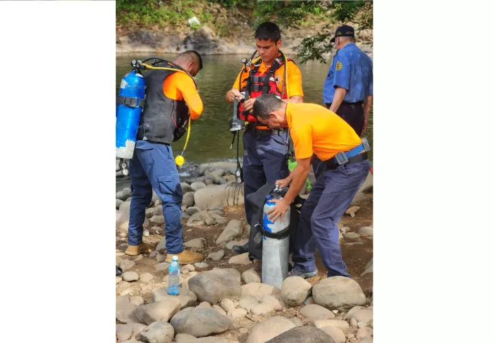 Buzos del Sistema Nacional de Protección Civil (Sinaproc) en conjunto con personal del Cuerpo de Bomberos de Panamá realizan la recuperación del cuerpo sin vida en las aguas del río Viguí, en el distrito de Tolé.