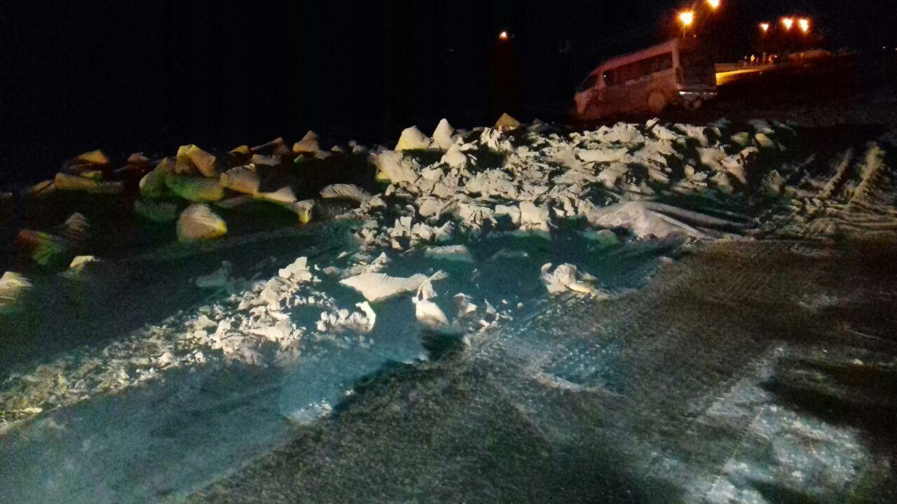 Se trataba de más de 50 sacos de cementos regados en la vía Interamericana por lo que el trabajo de los "camisas rojas" de Antón fue arduo para lograr limpiar y reabrila, mientras que el busito involucrado en el accidente quedó en medio de la cuneta que divide los cuatro carriles de la vía lleno de cemento, ya que los sacos cayeron sobre el.