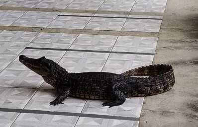 Un caimán merodeaba tranquilamente por la parte exterior de la Cooperativa de Educadores de Veraguas (COOPEVE, R.L.) sucursal de La Chorrera, provincia de Panamá Oeste.