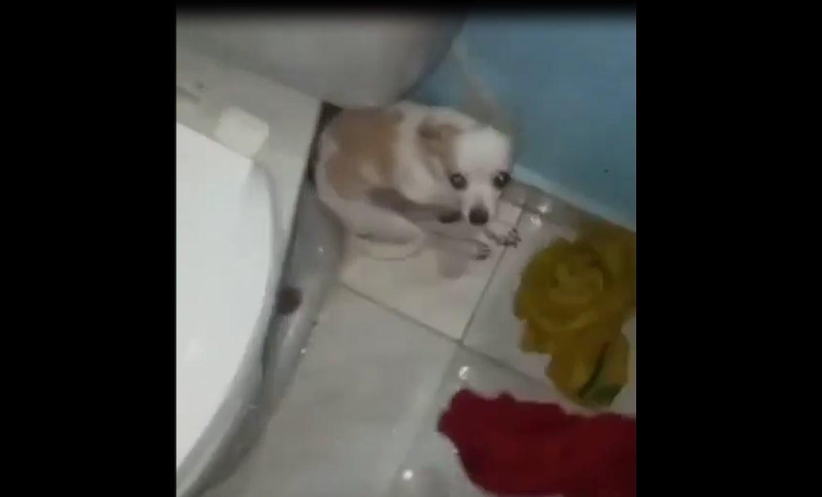 En las imágenes se aprecia al perrito asustado, acurrucado en una esquina del cuarto de baño tratando de escapar de su agresor. El sujeto, que no muestra su rostro, se acerca al perro blanco con manchas de color crema y le acaricia la cabeza con un par de dedos y de pronto lo toma por el cuello.