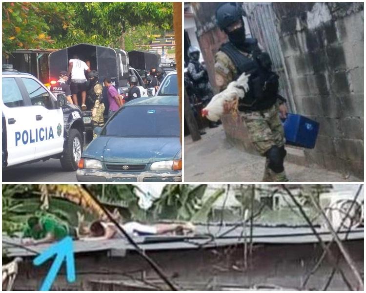En imágenes que circulan en las redes sociales se observan momentos en que los uniformados escoltan a los retenidos hacia una patrulla de la Policia mientras que otros dos sujetos intentan ocultarse en el techo de una residencia, mientras llovía.