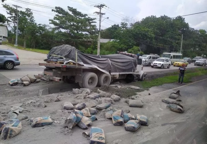 Los sacos de cemento quedaron regados en la vía Transístmica, a la altura de Las Cumbres, tras una colisión registrada entre un auto-taxi, tipo pick up; y un camión que transportaba la carga.