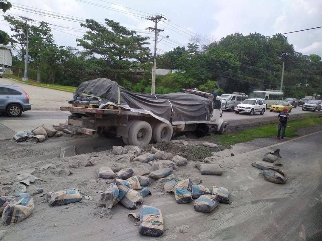 Los sacos de cemento quedaron regados en la vía Transístmica, a la altura de Las Cumbres, tras una colisión registrada entre un auto-taxi, tipo pick up; y un camión que transportaba la carga.