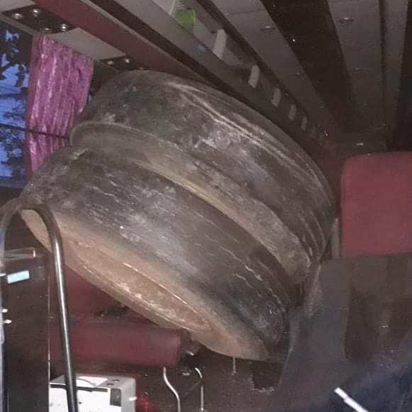 Del impacto de las llantas rompieron el parabrisa y quedó incrustrada en uno de los asientos del bus.