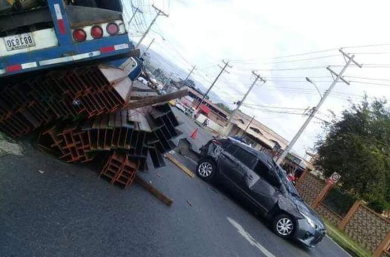 Dos personas resultaron afectadas, luego de que un camión articulado cargado de vigas de hierro se volcara debido al peso cuando se encontraba estacionado, y cayera casi encima de un vehículo tipo Toyota Yaris Hastback, de color gris, que transitaba en la vía José Agustín Arango, a la altura de Pedregal.