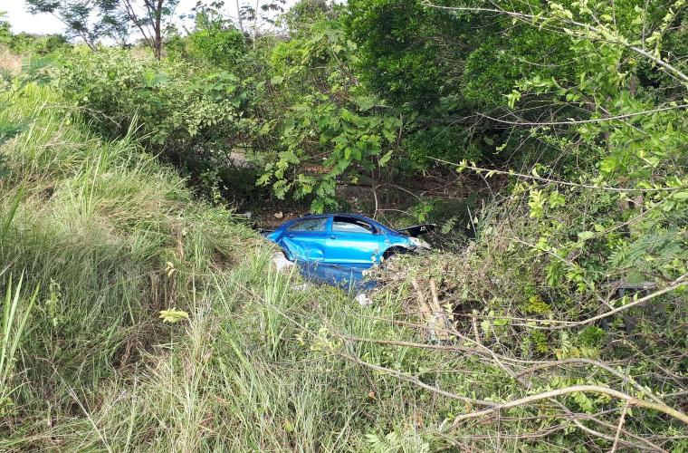 En la vía Interamericana, a la salida de Penonomé con dirección hacia Aguadulce y cerca al “Taller Ingramar”, un auto de color azul quedó en una quebrada. Su conductor resultó con heridas leves y pudo salir por sus propios medios del carro para contar que, afortunadamente, el agua de la quebrada amortiguó el golpe y él pudo salvar su vida.