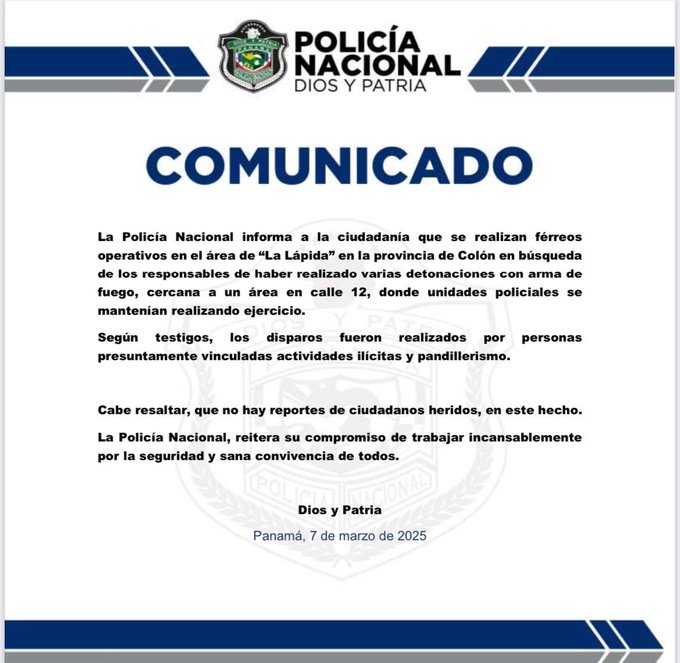 La noche de este viernes se escucharon disparos en los predios de la calle 12 avenida Meléndez, cerca a la sede policial en Colón, lo que motivo que agentes del orden público se dirigieran hacia el lugar donde se escucharon los disparos.
