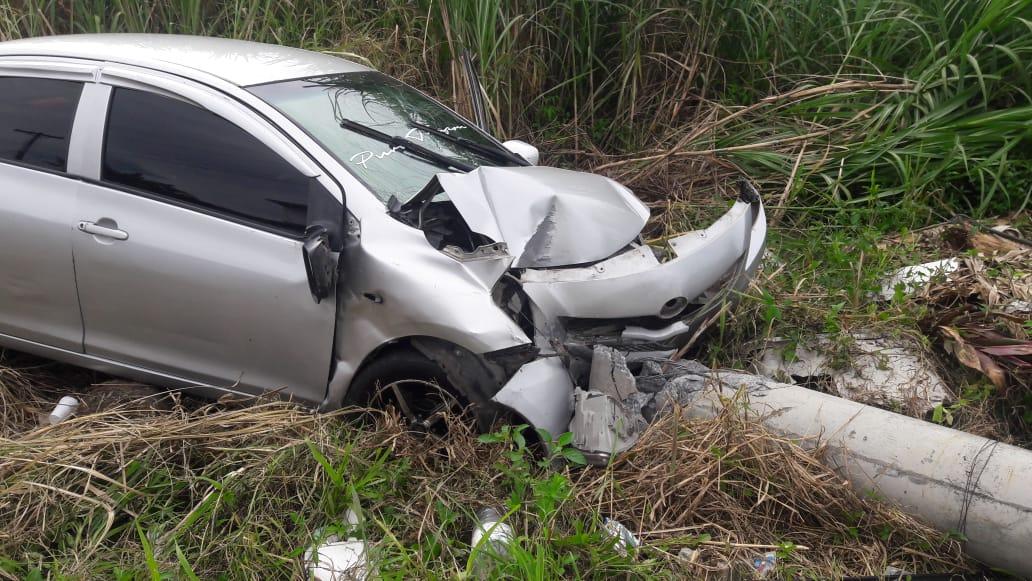 El hecho de tránsito ocurrió pasada las 1:40 p.m. de este sábado, cuando el conductor de un vehículo, tipo sedán, trató de rebasar y colisionó a otro auto, perdiendo el control en el manejo y choca contra el poste eléctrico.