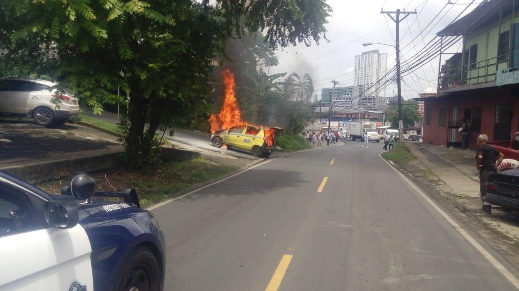 Un auto-taxi quedó envuelto en llamas hoy en la vía principal del corregimiento de Pueblo Nuevo, a la altura del centro de salud.