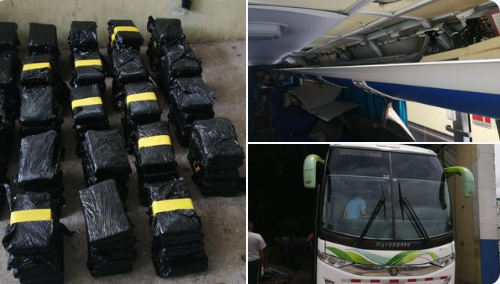 Los agentes policiales ubicaron 115 paquetes cocaína en el autobús, tipo coaster, ocultos en el compartimiento de equipaje de los pasajeros.