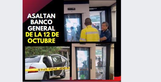 El Banco General fue asaltado por tercera ocasión este año. Ayer a las 4:20 p.m. cuatro delincuentes llegaron a la sucursal de la 12 de octubre, desarmaron al agente de seguridad, rompieron con un mazo los vidrios de la puerta de entrada y saltaron sobre los mostradores de atención para llenar en bolsas el dinero de los cajeros.