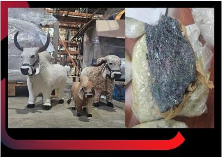 Lo que parecía ser un envío de bisutería y tapetes, resultó ser algo mucho más complejo. Dentro de los bultos, se hallaron figuras de toros de piel animal, pero lo más sorprendente fue que en su interior escondían piedras preciosas como pirita, diamantina, amatista y esmeralda verde.