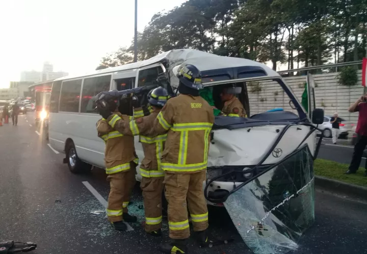 Unidades del Cuerpo de Bomberos de Panamá lograron hoy rescatar a mujer que quedó atrapada en bus, tipo coaster, luego de registrarse una colisión contra otro bus "diablo rojo" en la avenida Omar Torrijos.