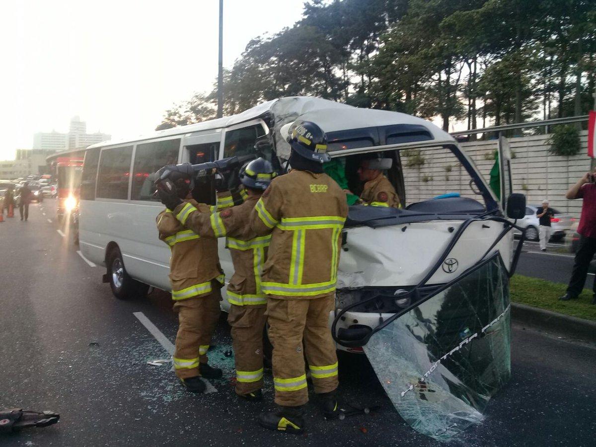 Unidades del Cuerpo de Bomberos de Panamá lograron hoy rescatar a mujer que quedó atrapada en bus, tipo coaster, luego de registrarse una colisión contra otro bus "diablo rojo" en la avenida Omar Torrijos.