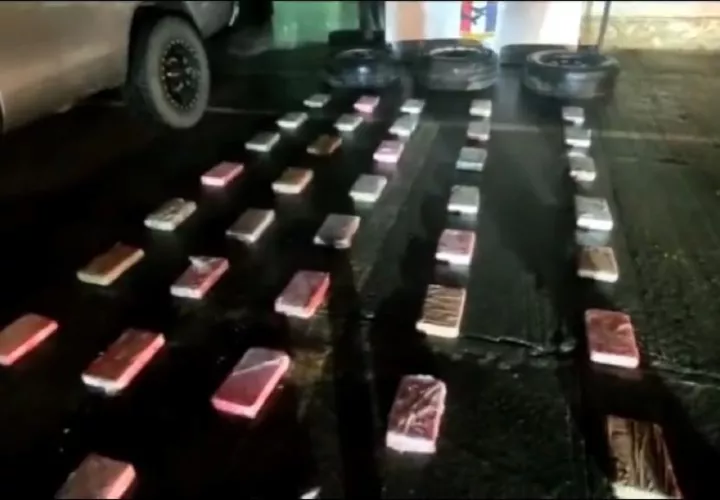 Y es que los agentes del Servicio Nacional de Fronteras (Senafront) al realizar la inspección en la cabina del vehículo, debajo de la mercancía ubicaron tres llantas donde ocultaban 37 paquetes de droga.