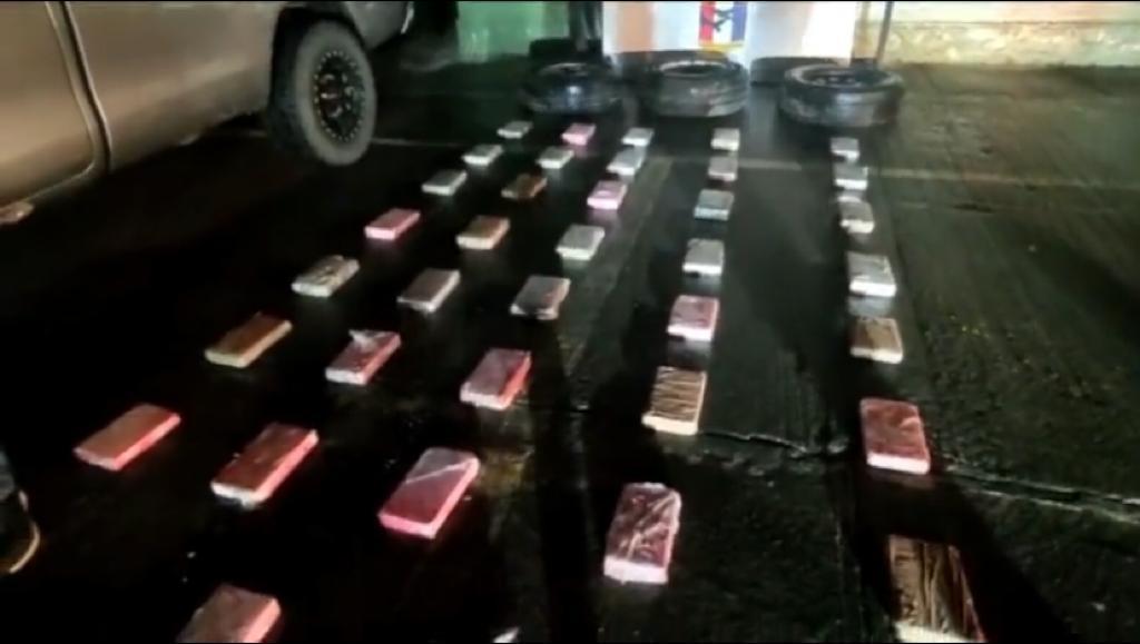 Y es que los agentes del Servicio Nacional de Fronteras (Senafront) al realizar la inspección en la cabina del vehículo, debajo de la mercancía ubicaron tres llantas donde ocultaban 37 paquetes de droga.