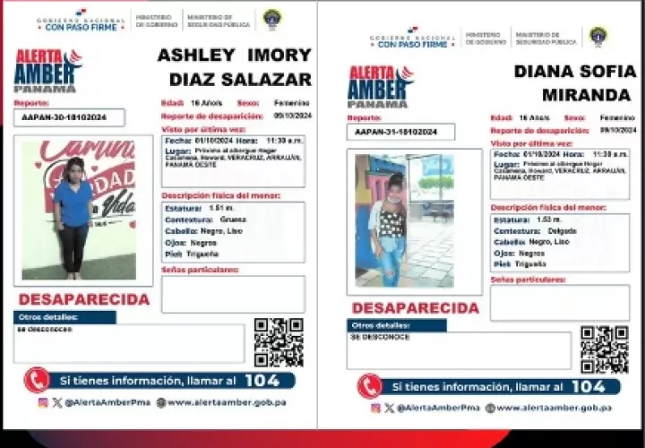 La preocupación se apodera de Panamá Oeste. El Ministerio Público ha activado tres alertas Amber para localizar a Rachell Brigiht Guevara Carrasco, Diana Sofia Miranda y Ashley Imory Díaz Salazar, todas de 16 años de edad.
