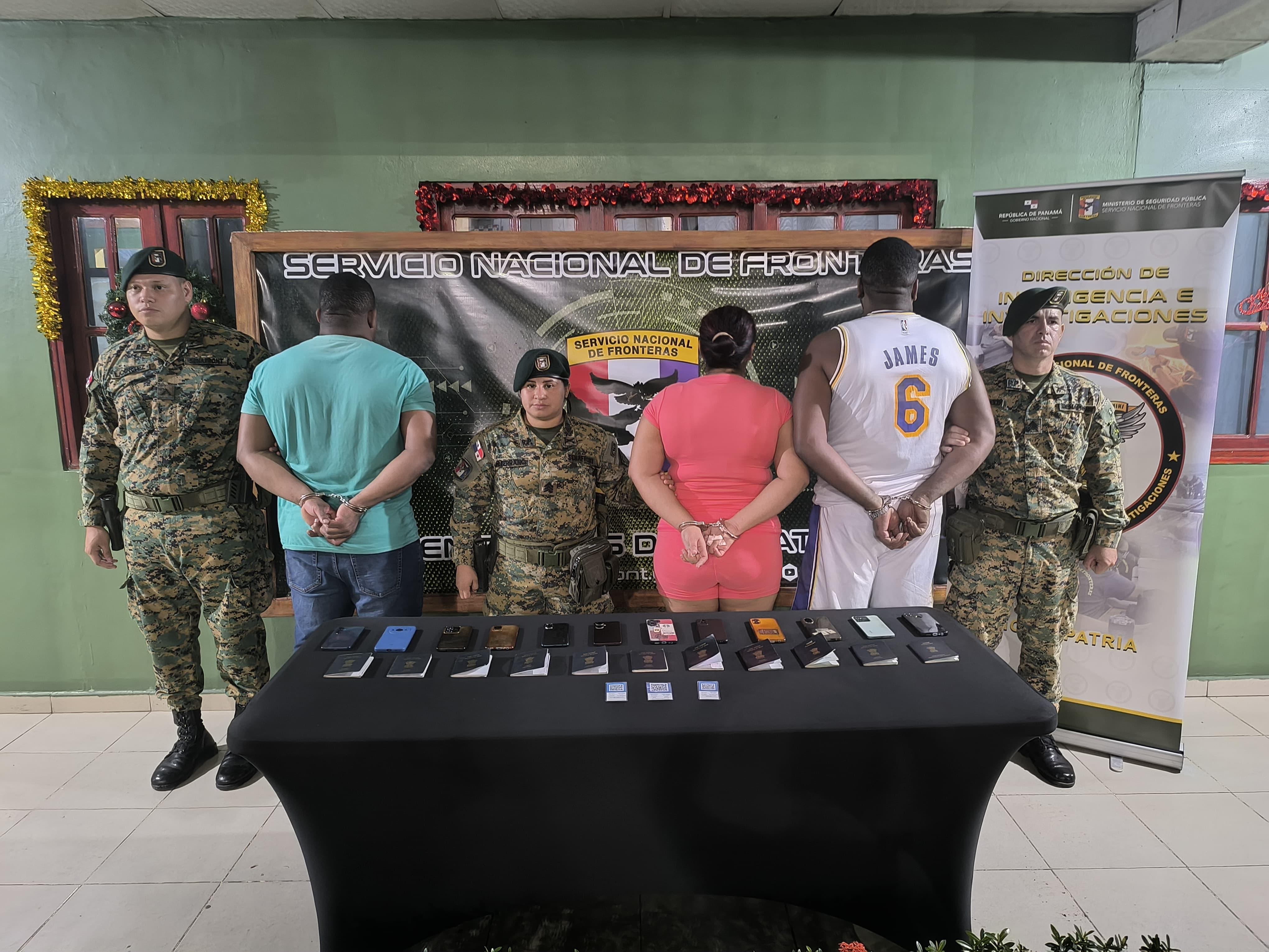 Unidades del Servicio Nacional de Fronteras lograron, en el Puesto de Control Integral de San Isidro, la aprehensión de dos hombres, de 34 y 39 años respectivamente, y una mujer de 32 años, por poseer 11 pasaportes de nacionalidad india y 12 teléfonos celulares.
