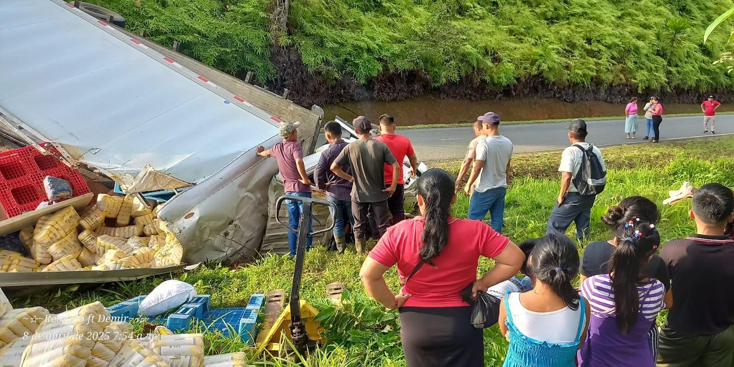 Un camión del Instituto de Mercadeo Agropecuario (IMA) cargado de arroz que se dirigía hacia el Valle de Riscó sufrió un accidente esta mañana en la bajada hacia El Nance de Riscó, Almirante, provincia de Bocas del Toro.