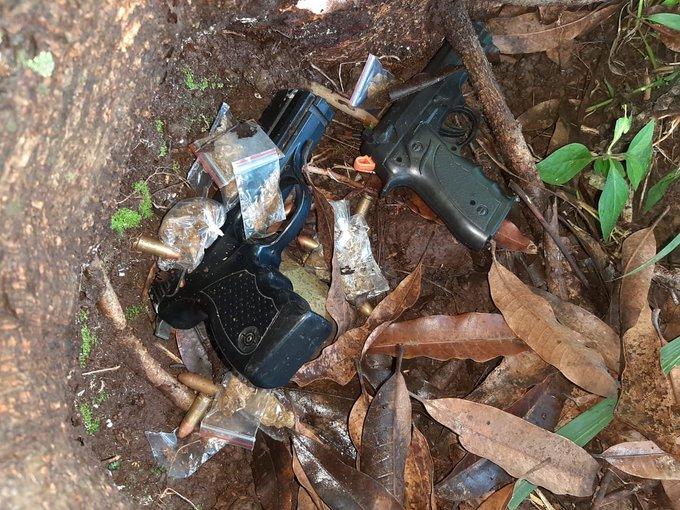 Una de las armas y sobrecitos de droga se encontraron ocultos entre la maleza.