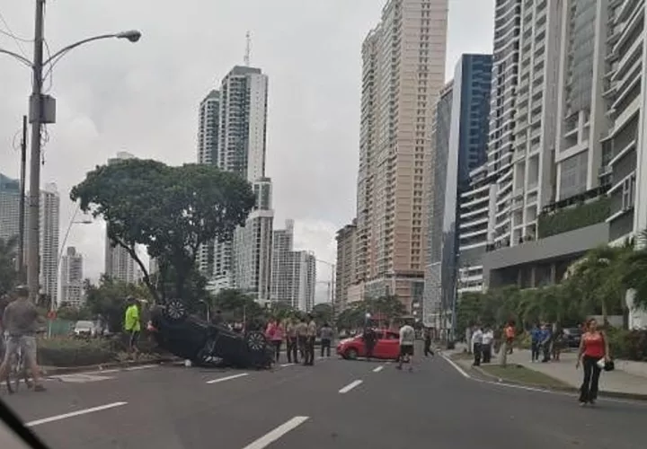 #SucesosCri Colisión en la Avenida Balboa, a la altura de Marbella. Uno de los vehículos involucrados terminó volcado. Video: @TraficoCPanama pic.twitter.com/PEqat7hd3A