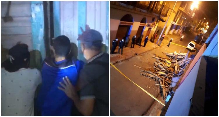 Imágenes que se publicaron en redes sociales mostraron los momentos en que tres hombres rompen una puerta de madera para socorrer a las personas tras el colapso de la estructura.