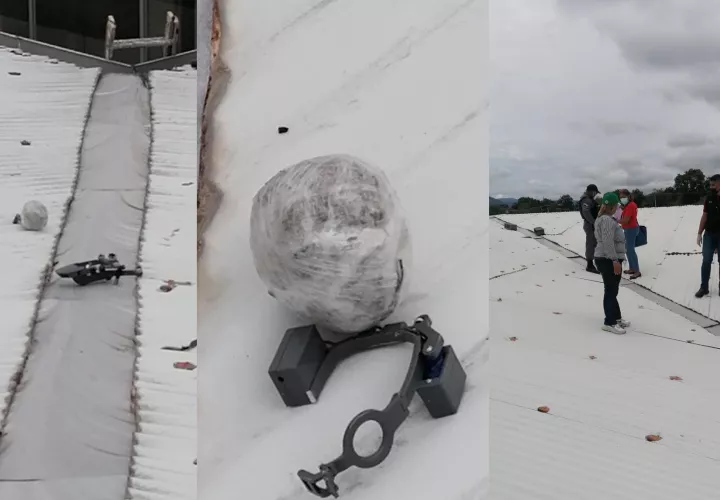 Custodios decomisaron un dron portando un embalaje circular forrado con cinta adhesiva transparente, en su interior con materia vegetal presumiblemente marihuana que cayó en el techo de la escuela del Centro de Cumplimiento de Las Garzas (CCLG).