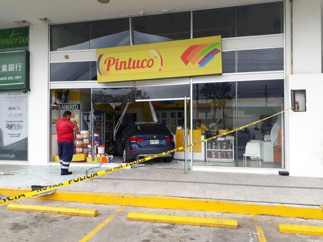 Conductora perdió el control de su vehículo y terminó estrellándolo contra un local de venta de pinturas en un comercial ubicado en Condado del Rey, sobre la avenida Tumba Muerto, la tarde de este viernes.
