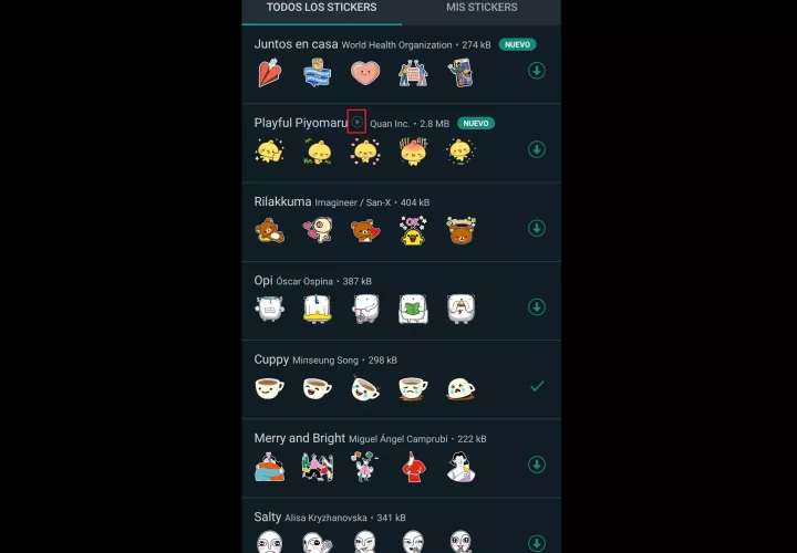 4. Seleccioná el paquete de stickers animados de WhatsApp con el nombre “Playful Piyomaru” que, al momento de hacer este artículo, es el único animado que se encontró disponible. Los stickers animados se reconocen porque tienen un signo de “Play” junto al nombre. Es posible que se vayan sumando más packs animados, además del mencionado.