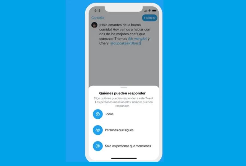 Al momento de escribir el tuit y, antes de publicarlo, se podrá elegir quién puede responder entre tres opciones: a) todos (Twitter estándar, y la configuración predeterminada), b) solo las personas que segues o c) solo las personas que mencionas.