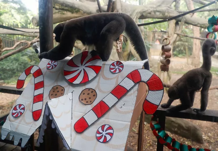 Los promotores de bienestar animal del zoológico colocaron decoraciones de cartón en cada uno de los espacios del parque que, dependiendo de la especie, tenían ocultos trozos de carne y frutas en decoraciones navideñas para incentivar la exploración.