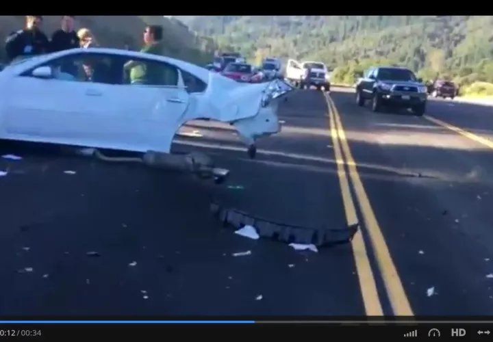 Esta mujer salvo la vida de manera milagrosa tras un aparatoso accidente el automóvil involucrado se partió en dos. La conductora espera sin moverse la llegada de los médicos.en medio del caos total.