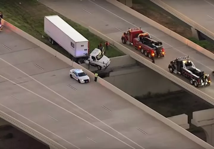 El conductor de un camión de 18 ruedas salió ileso, después que su camión quedó colgando sobre un puente de una carretera de Houston, Texas, EE.UU.
