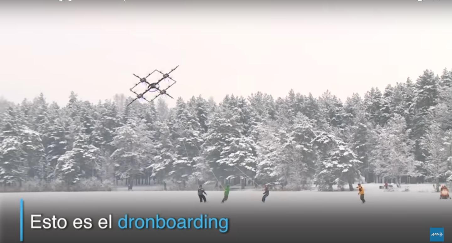 Fue inventado en Letonia y aún está en estado experimental. Unidos a un potente dron, hasta cuatro 'snowboarders' pueden deslizarse con sus tablas sobre el hielo a gran velocidad.