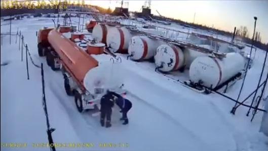 En un video filmado por una cámara de seguridad del campo petrolífero ruso de Gustorechensk, y colgado en la cuenta Wico TUbe hace un par de días, se observa a dos hombres, en la parte trasera de un camión cisterna cargado de combustible, empleando una llama, al parecer para encender o descongelar algo, lo que viola las reglas de seguridad para este tipo de transporte.