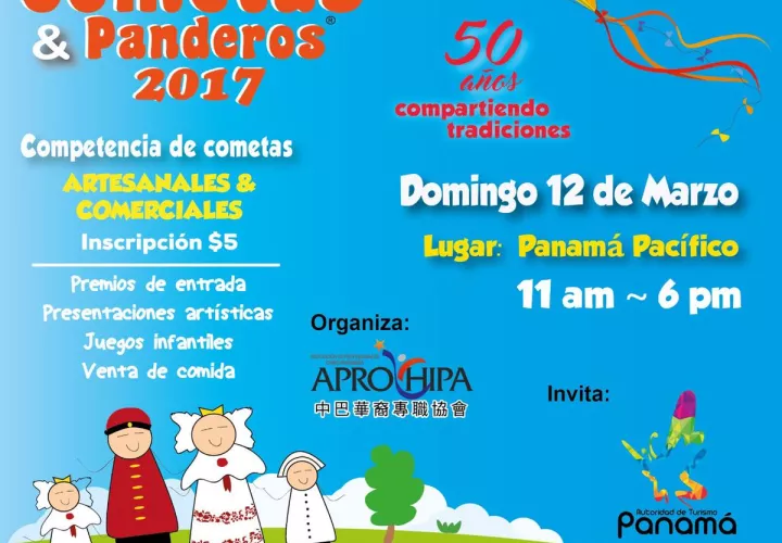 La Asociación de Profesionales Chino- Panameña (APROCHIPA) y la Autoridad de Turismo de Panamá (ATP) organizan la versión número XVII del Festival de Cometas y Panderos se llevará a cabo mañana, 12 de marzo, de 11:00 a.m. a 6:00 p.m., en las inmediaciones del Boulevard Panamá Pacífico, antigua base de Howard.