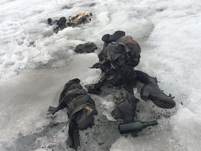 Los restos mortales y los objetos encontrados a su lado (mochilas, un botella, un libro y un reloj) fueron analizados por forenses en el glaciar mismo, situado a una altitud de 2.615 metros.