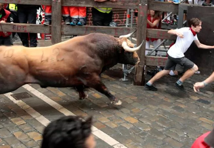 El toro "Huracán", de la debutante ganadería de Puerto de San Lorenzo, ha protagonizado el multitudinario encierro de hoy al adelantar a la manada en el primer tramo de la carrera.