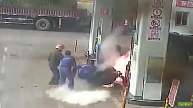 A pesar de los esfuerzos, la motocicleta no se apaga y en un acto heroico, la uno de los trabajadores de la estación de combustible empieza a arrastrar la motocicleta lejos del surtidor donde finalmente sofocan las llamas.